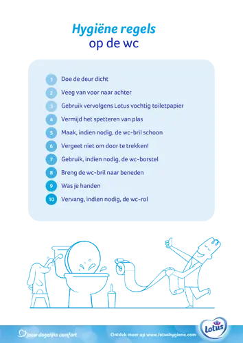 - Eindig met vochtig toiletpapier. Je tekstbord met wc-regels herinnert iedereen aan de beste billenveegroutine: gebruik eerst droog toiletpapier en vervolgens doorspoelbaar Lotus vochtig toiletpapier voor een extra schoon en fris gevoel.