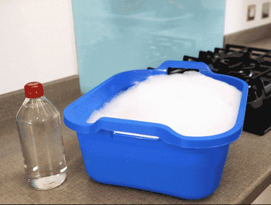 Tarvitset kumihansikkaat, valkoviinietikkaa, ruokasoodaa, kuumaa saippuavettä sekä pehmeän harjan.