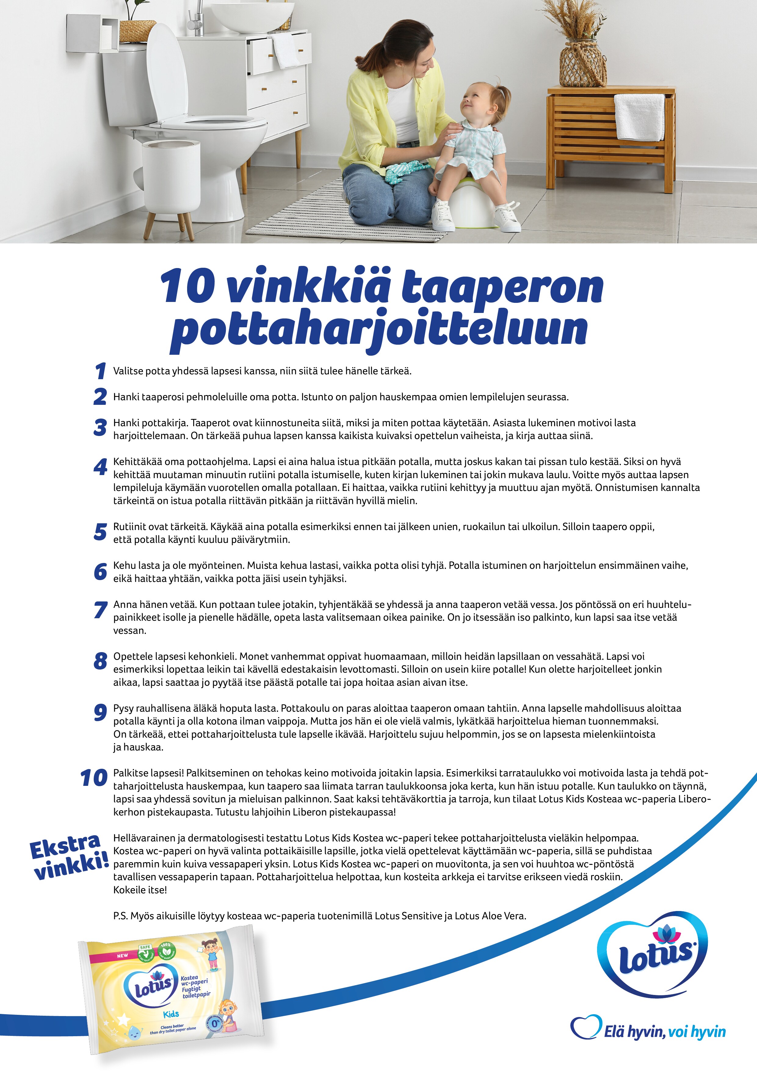 Se sisältää oheisen oppaan lisäksi kaksi Lotus Kids Kostea wc-paperi -pakkausta ja Liberon Pottaharjoittelu Osaan itse -korttia & Tarroja palkitsemiseen. Tämä on helppo tapa päästä kokeilemaan Lotus Kids -tuotettamme ja tehdä pottaharjoittelusta hieman helpompaa ja hauskempaa!