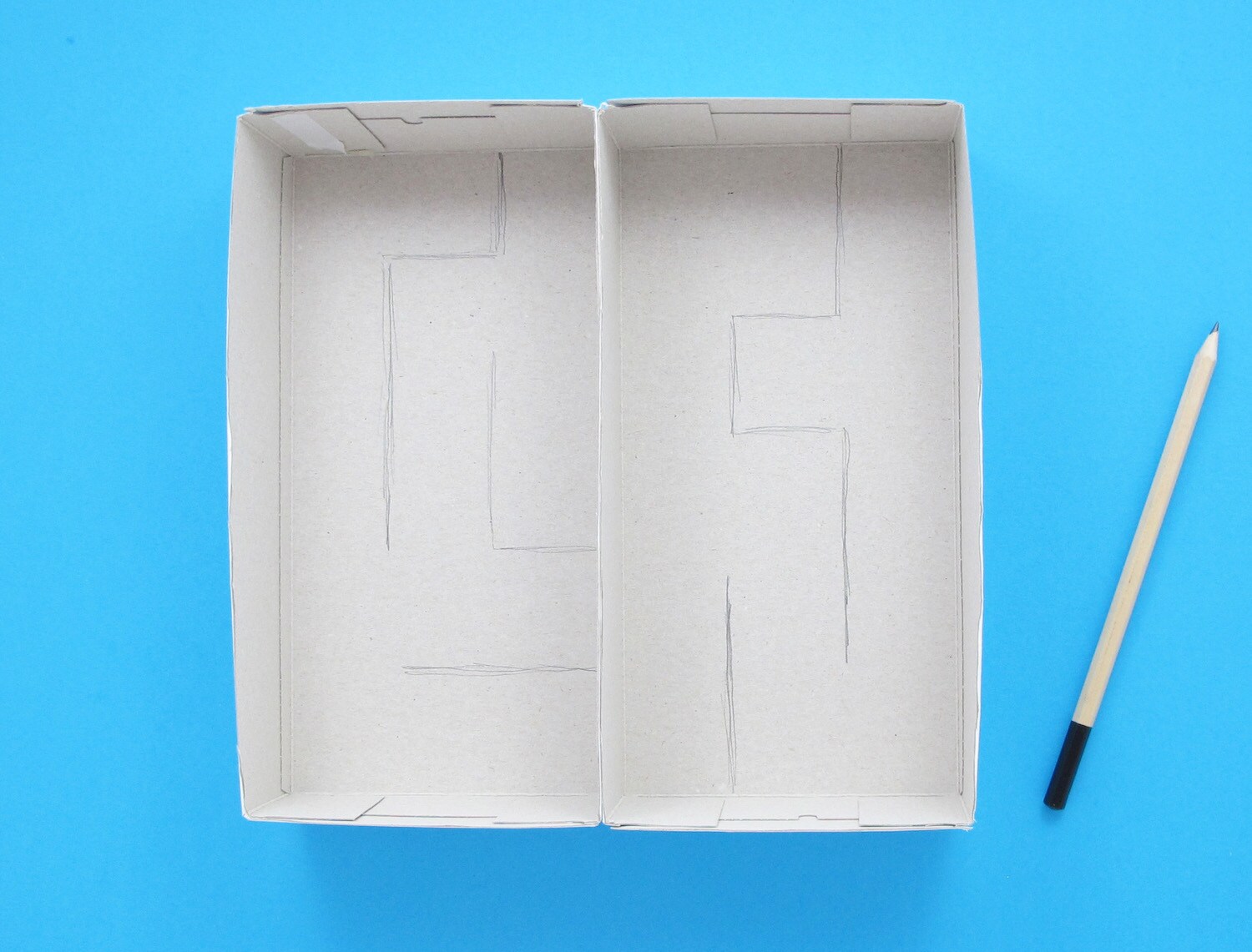 Maintenant, préparez les plans de votre labyrinthe en dessinant au crayon à papier la position des murs au fond des boîtes ainsi assemblées.